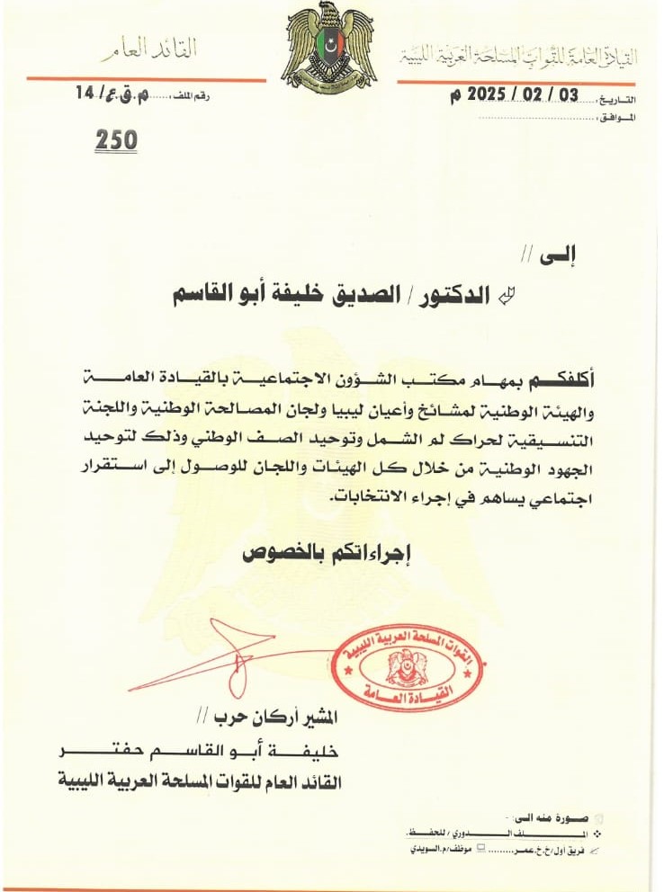 وتضمّن التكليف الجديد للدكتور الصدّيق القيام بمهام مكتب الشؤون الاجتماعية بالقيادة العامة والهيئة الوطنية لمشايخ وأعيان ليبيا ولجان المصالحة الوطنية واللجنة التنسيقية لحراك لمّ الشمل وتوحيد الصفّ الوطني، وذلك لتوحيد الجهود الوطنية من خلال كلّ الهيئات واللجان للوصول إلى استقرار اجتماعي يساهم في إجراء الانتخابات.