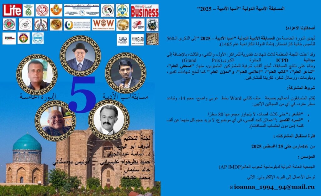 تهدف “آسيا الأدبية – 2025” التي أسسها الأديب الكازاخي بخيت رستموف إلى اكتشاف المواهب الأدبية ودعم التبادل الثقافي بين شعوب آسيا والعالم. وتُمنح ثلاث شهادات تقديرية للفائزين بالمراكز الثلاثة الأولى، بالإضافة إلى ميدالية ICPD للجائزة الكبرى (Grand Prix).