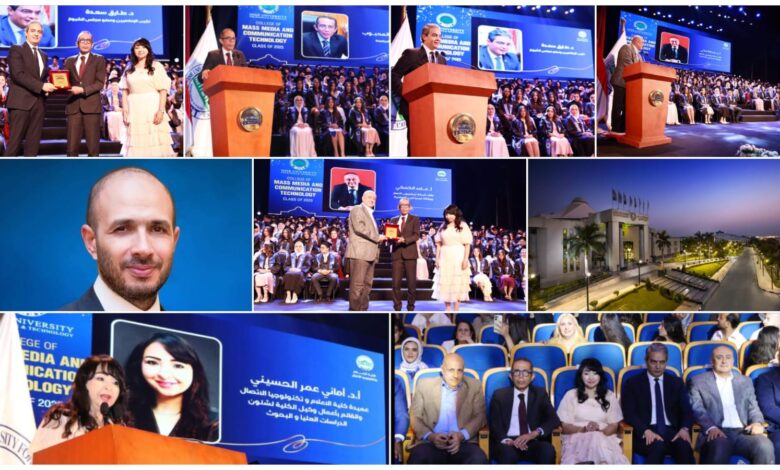 وهنأ الدكتور نهاد المحبوب القائم بأعمال رئيس جامعة مصر للعلوم والتكنولوجيا الطلاب الخريجين، مؤكدًا أن الجامعة تفتخر بخريجي كلية الإعلام لما أثبتوه من جدية والتزام وقدرة على التطور، وقال: “أنتم اليوم تقفون على أعتاب مرحلة جديدة، مزودين بأسلحة ذكية تتمثل في العلم، والمهارة، والانضباط، والإبداع، وهذه أدوات النجاح في الإعلام المعاصر”.
