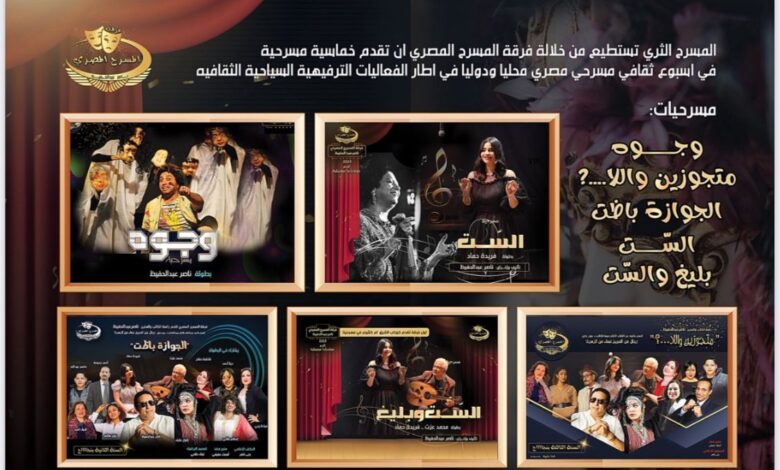 بمناسبة الاحتفال بانتصارات أكتوبر المجيدة، تختتم فرقة المسرح المصري غدًا الخميس عروض خماسيتها المسرحية التي قُدمت خلال الموسم الصيفي، وذلك من خلال سهرة كوميدية غنائية تُقام بحضور الصحفيين والإعلاميين مجانًا بصحبة أسرهم، بأسبقية الحضور وبعد التنسيق.